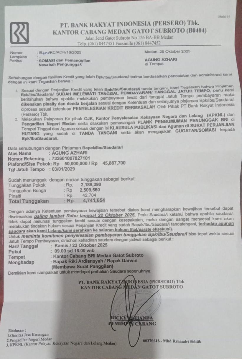 Somasi dan pemanggila nasabah pengunggak diantar langsung oleh petugas BRI Sidik Rahardika ke kediaman almarhum Siti Hayati. Sontak Wijaya Kesuma kaget, somasi dia terima sementara pihaknya tidak tau menahu soal pinjaman. Terakhir diketahui Agung Azhari sudah melarikan diri pasca menerima kredit.