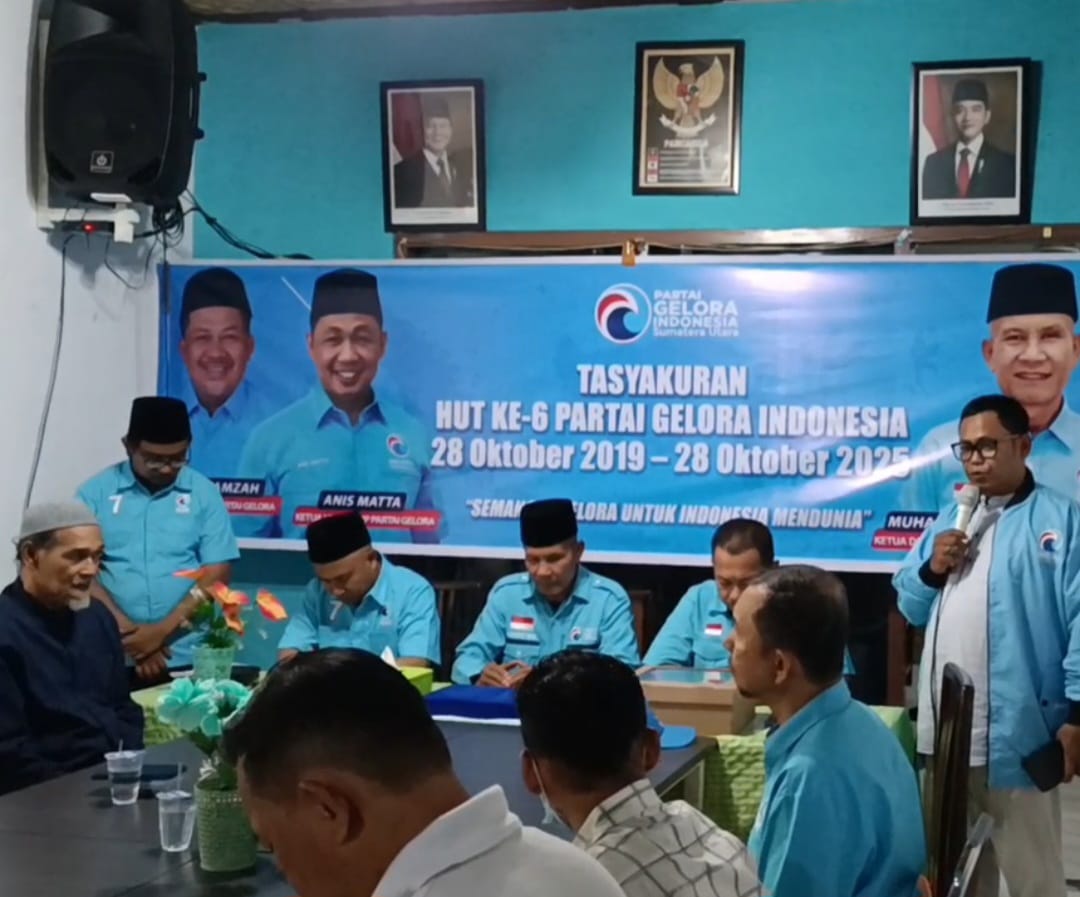 Medan | TIME LINE NEWS IDN.com-Dewan Pimpinan Wilayah (DPW) Partai Gelombang Rakyat (Gelora) Indonesia Sumatera Utara menggelar tasyakuran Hari Ulang Tahun (HUT) ke-6 bertema “Semangat Gelora untuk Indonesia Mendunia”, Selasa (28/10/2025), di kantor DPW Gelora Sumut, Jalan Pencak Nomor 29, Kelurahan Pasar Merah Barat, Kecamatan Medan Kota. Jumat (31/10)