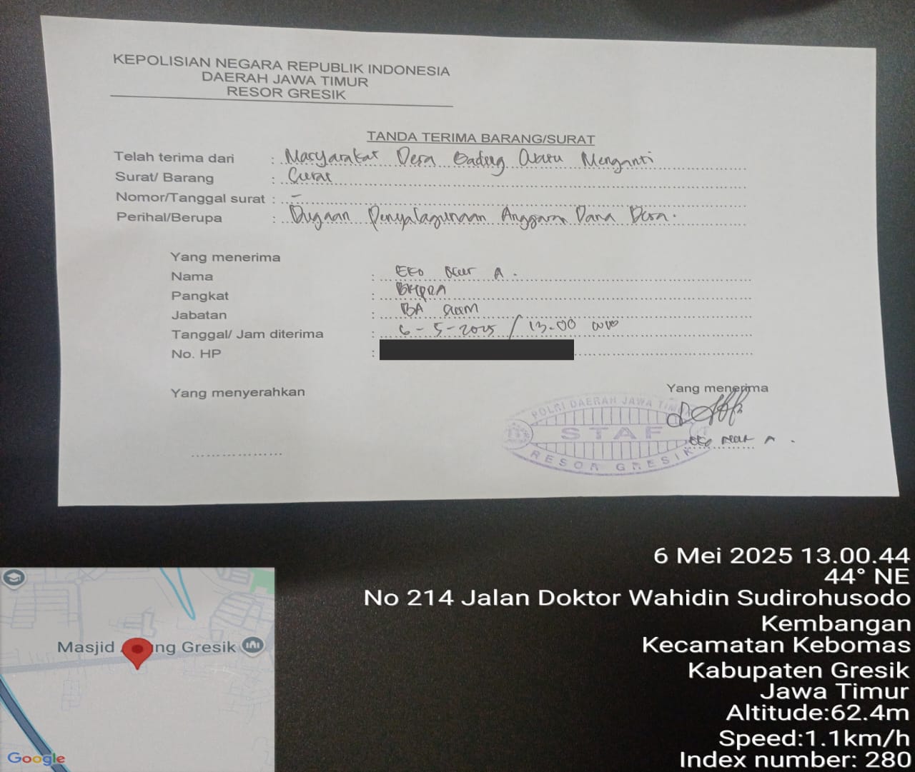 Gresik | Timelinenewsidn.com-Suasana di Mapolres Gresik mendadak ramai, Selasa (6/5/2025), ketika Warga Desa Gadingwatu berbondong-bondong mendatangi markas polisi tersebut. Mereka datang dengan satu tujuan: menyerahkan petisi dukungan atas pelaporan dugaan penyalahgunaan wewenang dan jabatan oleh Kepala Desa Gadingwatu yang diduga melakukan korupsi dana desa.
