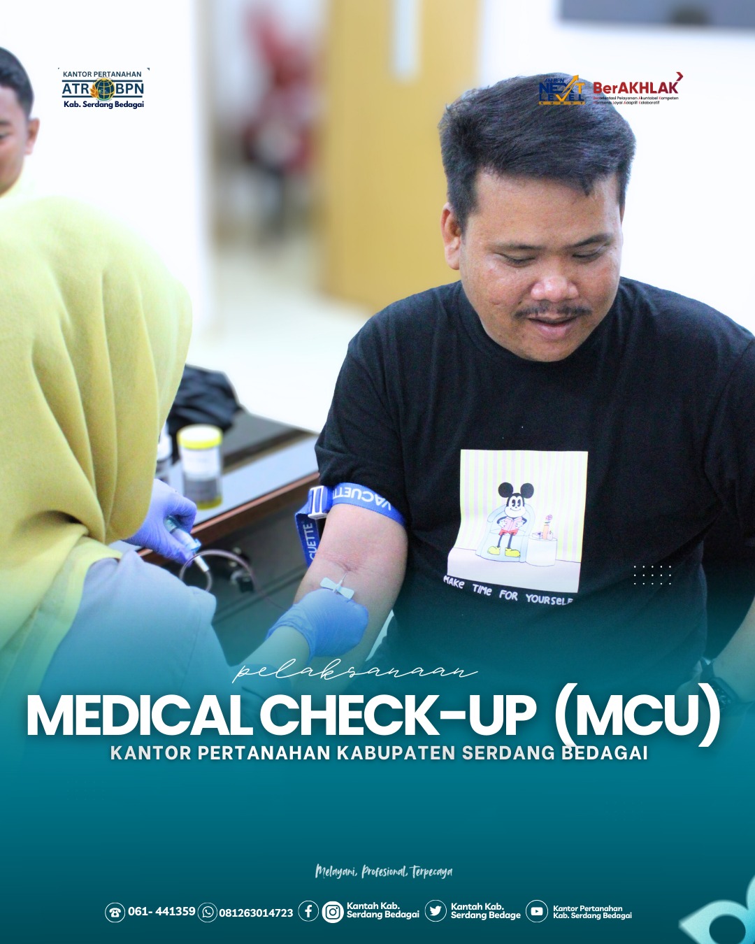 Pelaksanaan Medical Check Up ini merupakan bagian dari komitmen Kantor Pertanahan Kabupaten Serdang Bedagai dalam menjaga kesehatan dan kebugaran seluruh pegawai sebagai aset utama organisasi. Kesehatan yang prima menjadi salah satu faktor penting dalam mendukung produktivitas kerja, meningkatkan semangat pelayanan, serta memastikan setiap tugas dan fungsi pertanahan dapat dilaksanakan secara optimal. (Rel/SB)