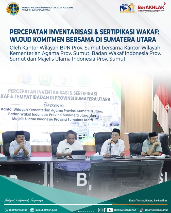 Medan | TIME LINE NEWS IDN.com,- Kantor Wilayah Badan Pertanahan Nasional Provinsi Sumatera Utara melaksanakan kegiatan Percepatan Inventarisasi dan Sertipikasi Wakaf dan Tempat Ibadah bersama Kantor Wilayah Kementerian Agama Provinsi Sumatera Utara, Badan Wakaf Indonesia Provinsi Sumatera Utara, dan Majelis Ulama Indonesia Provinsi Sumatera Utara. Kegiatan ini dilaksanakan secara daring dan luring sebagai bentuk sinergi, kolaborasi, dan komitmen bersama dalam mengakselerasi legalisasi aset wakaf secara menyeluruh dan terintegrasi.