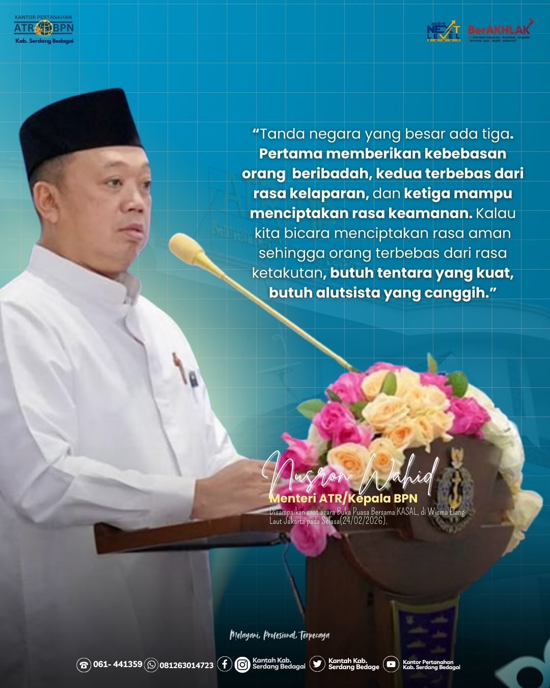 Jakart | TIME LINE NEWS IDN.com,- Menteri Agraria dan Tata Ruang/Badan Pertanahan Nasional (ATR/BPN), Nusron Wahid, menyampaikan tausiah dalam acara Buka Puasa Bersama Kepala Staf Angkatan Laut di Wisma Elang Laut, Jakarta, Selasa (24/02/2026). Ia menegaskan bahwa negara besar ditandai dengan kebebasan beribadah, terbebas dari kelaparan, dan kemampuan menciptakan rasa aman bagi masyarakat.