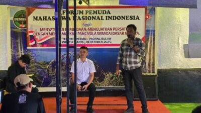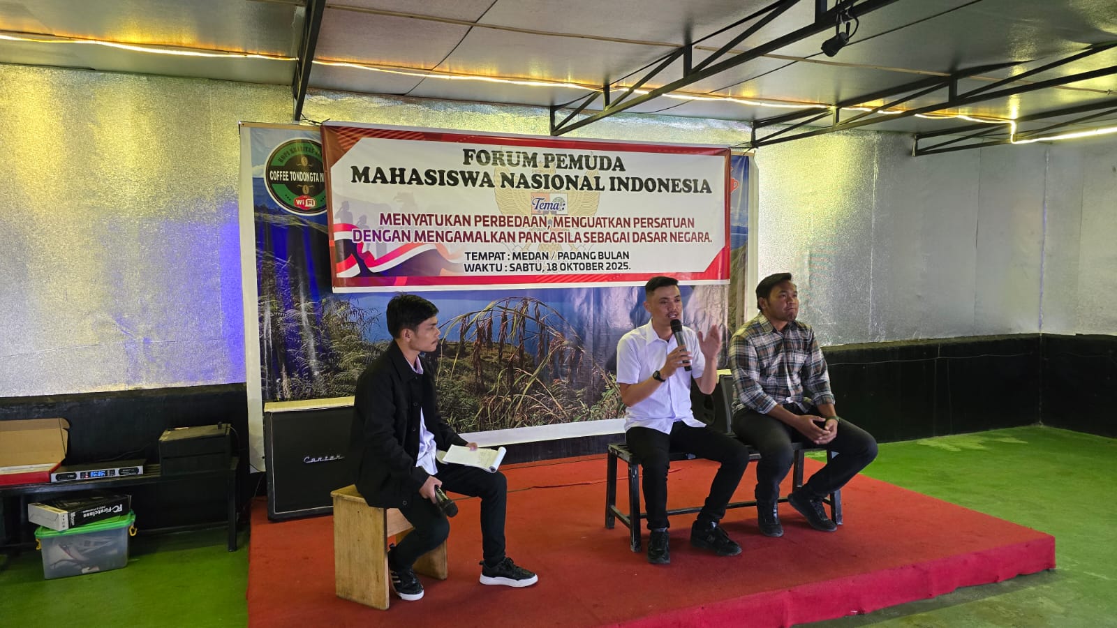 Foto : Koordinator Forum Pemuda Mahasiswa Nasional Indonesia, Ambrin BW Simbolon dalam diskusi bertema “Menyatukan perbedaan, menguatkan persatuan dengan mengamalkan Pancasila sebagai dasar negara”, Sabtu (18/10) di Medan. (Ist)