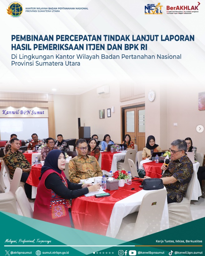 Medan | TIME LINE NEWS IDN.com,- Pembinaan Percepatan Tindak Lanjut Laporan Hasil Pemeriksaan yang dilaksanakan oleh Inspektorat Jenderal dan Badan Pemeriksa Keuangan Republik Indonesia di lingkungan Kantor Wilayah Badan Pertanahan Nasional Provinsi Sumatera Utara,