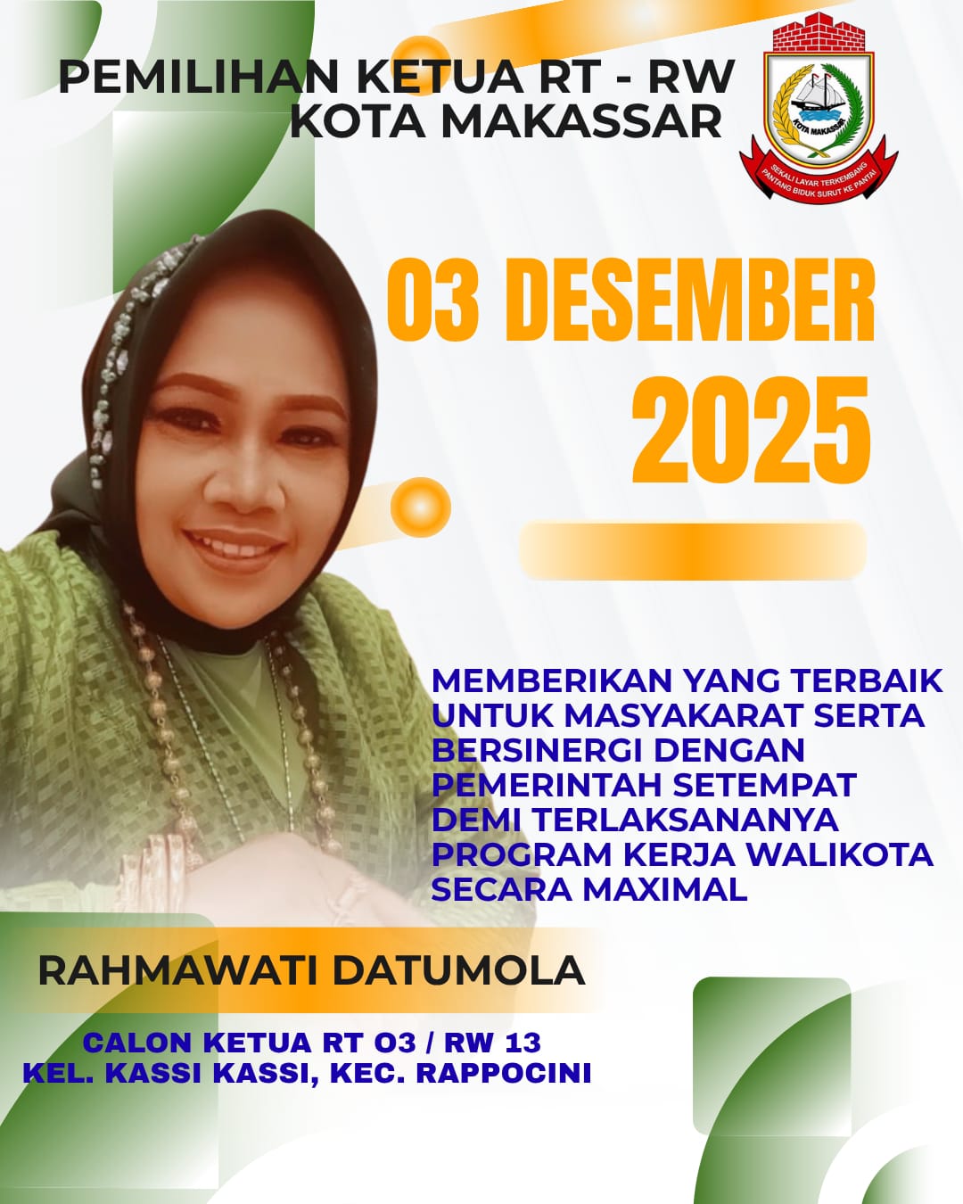 Makassar | TIME LINE NEWS IDN.com,-Kelurahan Kassi-Kassi tengah memasuki suasana pemilihan Ketua RT yang semakin dinamis. Dalam beberapa pekan terakhir, perhatian warga tertuju pada satu nama yang tidak asing lagi: Rahmawati Datumola, atau yang akrab disapa Bu Rahma. Sosok perempuan aktif dan berdedikasi ini resmi mendeklarasikan diri sebagai calon Ketua RT 003, membawa optimisme baru serta harapan perubahan bagi masyarakat setempat. Jumat (14/11/2025)