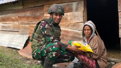 Kepedulian dan kehangatan prajurit Satgas Yonif 521/DY dalam penyaluran sembako, Mereka turun langsung ke kampung-kampung untuk membagikan sembako berupa beras kepada warga.